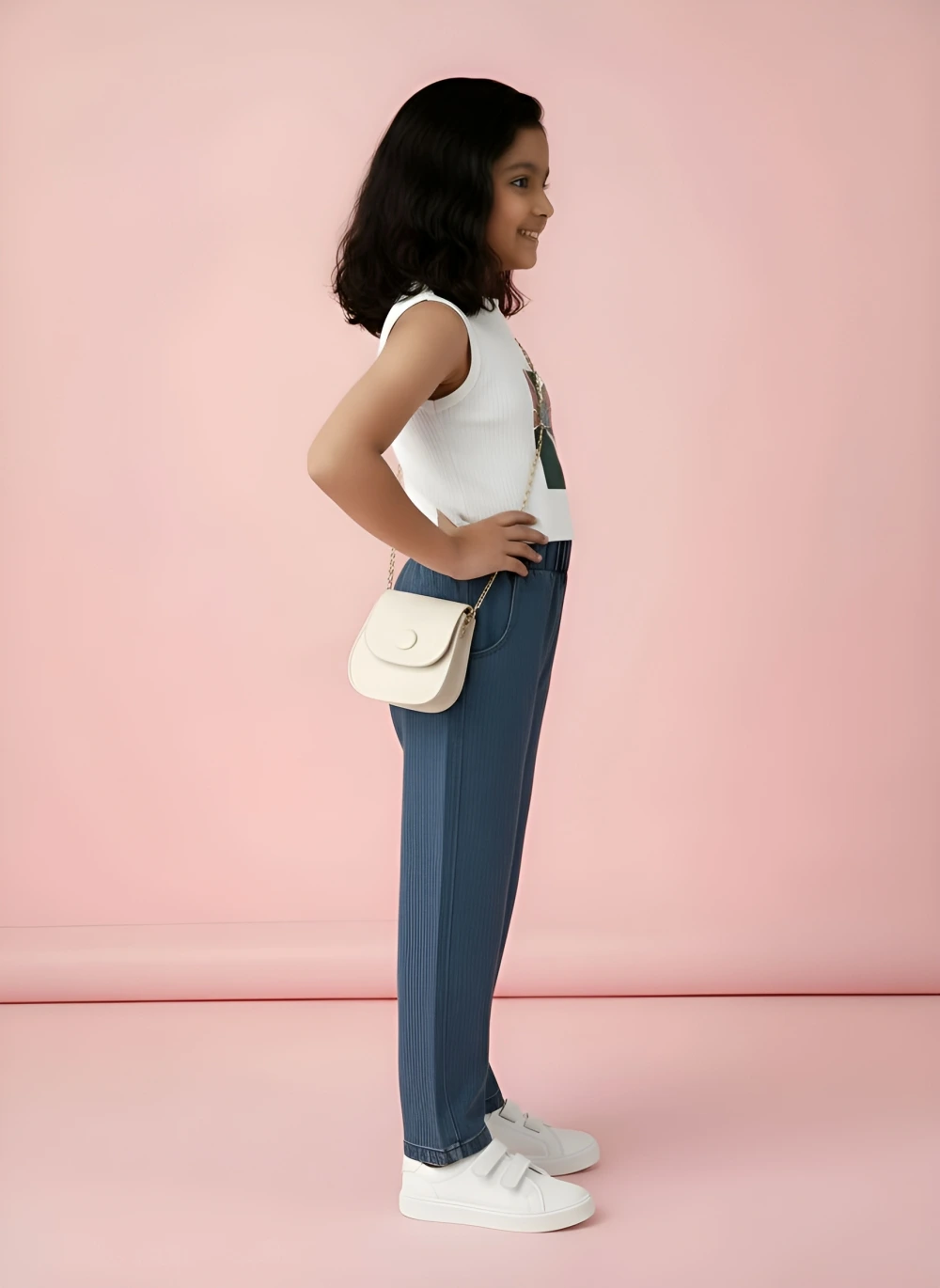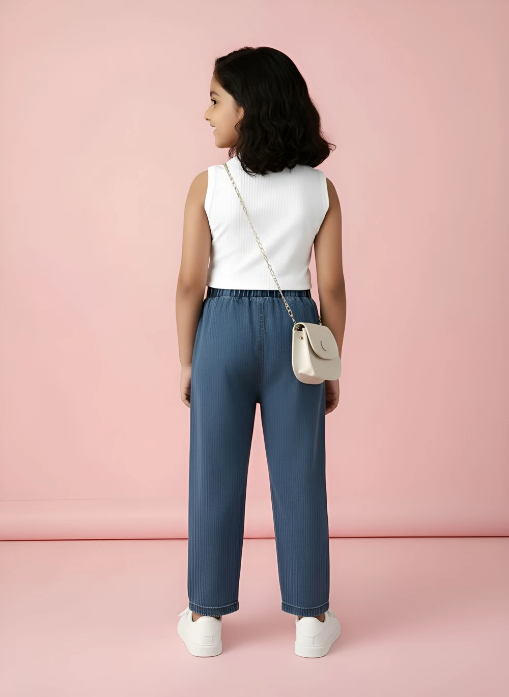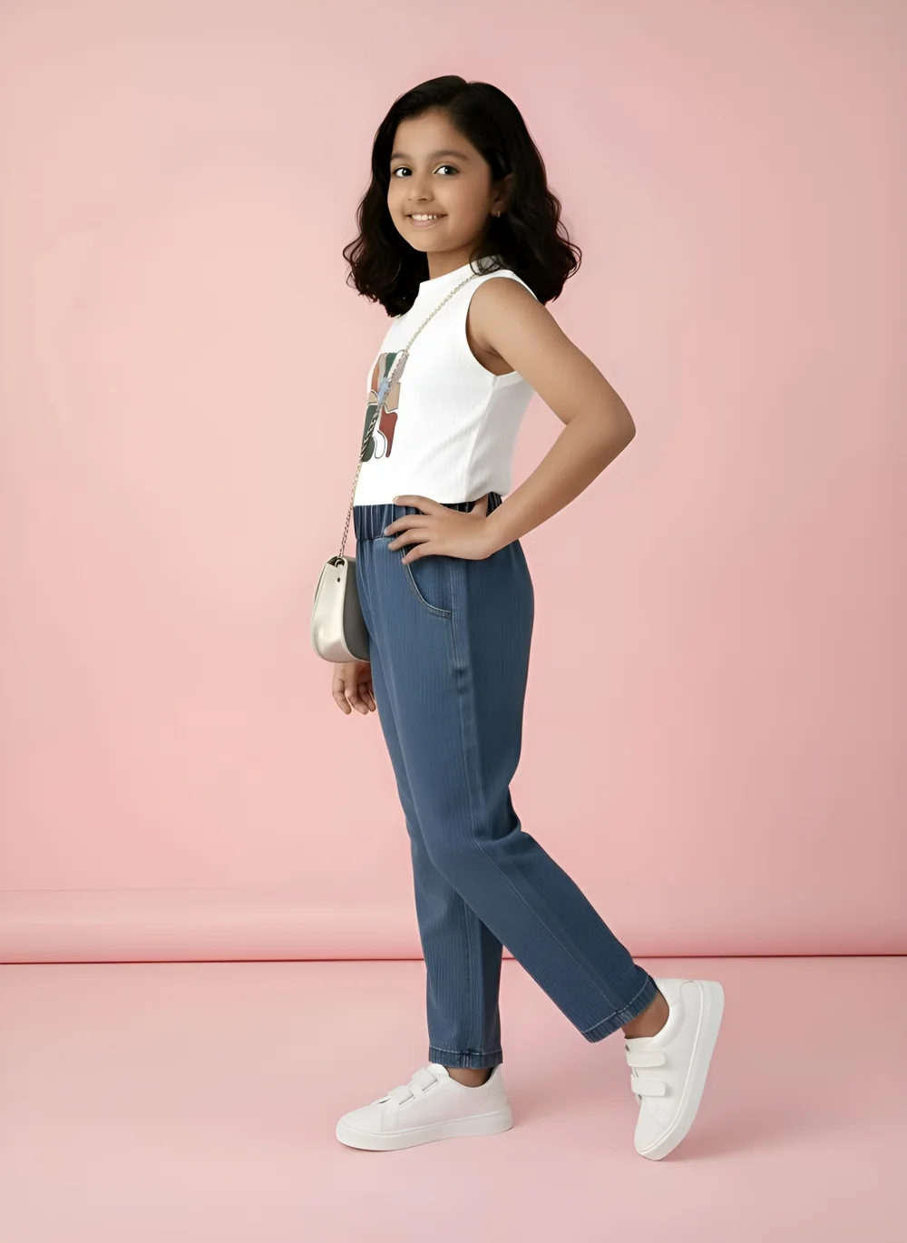 A stylish white top paired with classic denim jeans, perfect for everyday comfort and casual outings. Easy to wear, versatile, and suitable for all-day use.